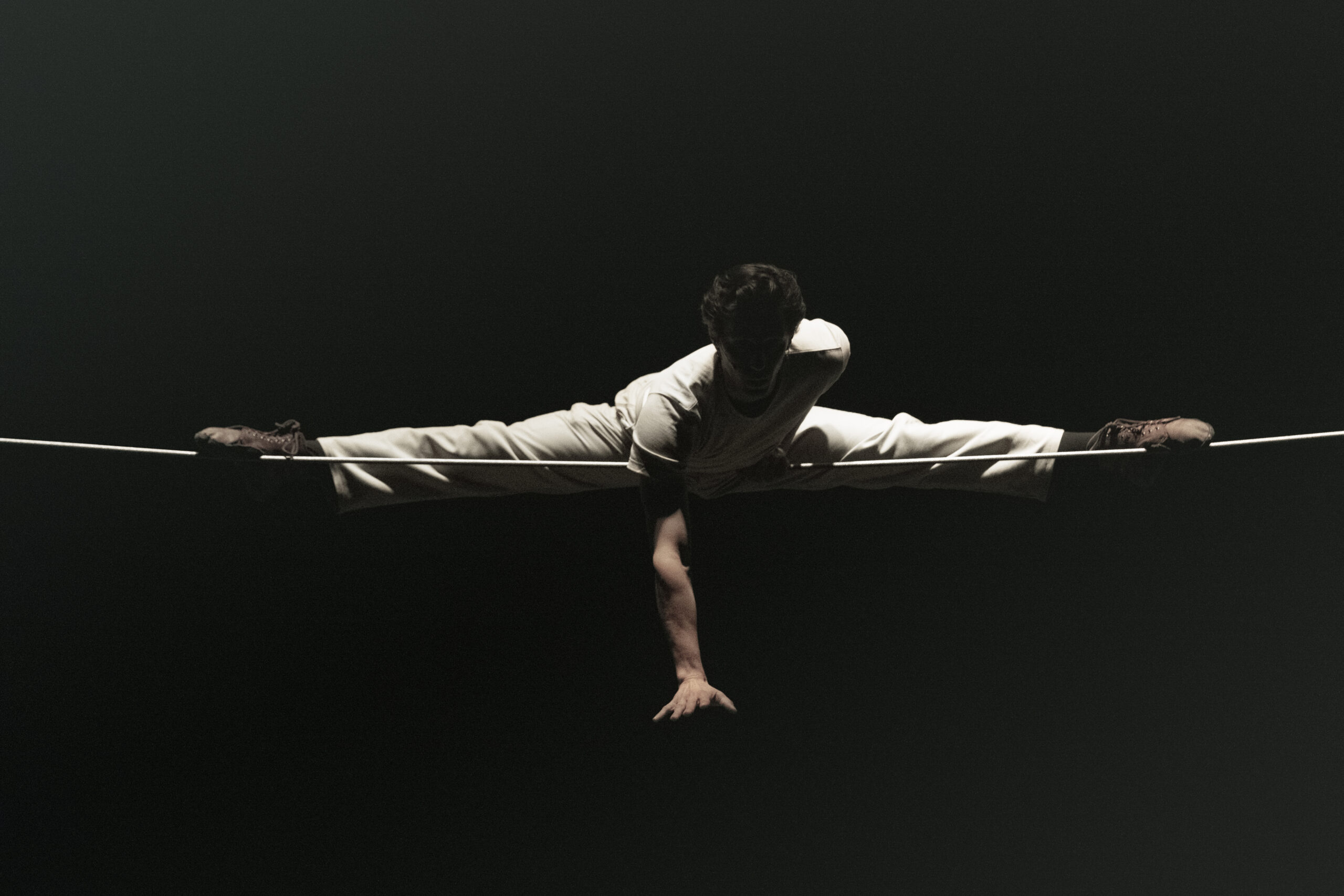 Clément Dazin : « En 2009, je rencontre Lucas Bergandi, fil-de-fériste virtuose, nous étudions ensemble pendant trois ans au CNAC. Il est fascinant, il met sa vie en danger sur le fil à chaque instant. Il semble hermétique à la peur. Pourtant, quand je l’invite à performer au Théâtre du Rond point en septembre 2021, il monte sur le fil, me regarde et lâche : « J’ai peur Clément, ça fait longtemps que ça ne m‘ait pas arrivé mais j’ai peur… ».